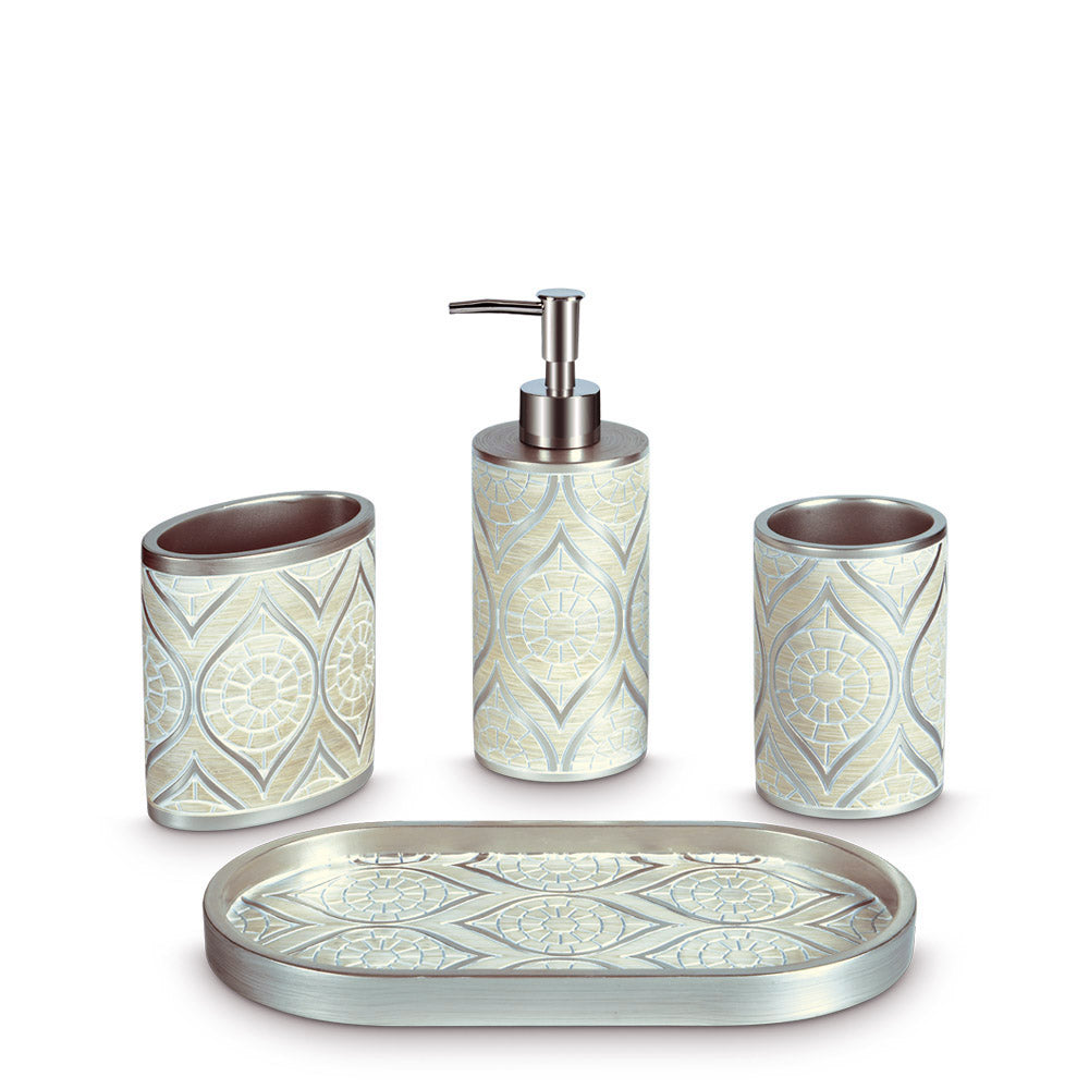 Bathroom set with soap dispenser, toothbrush holder, tumbler, and soap dish Soap dish helps keep the sink residue-free Toothbrush holder stores 4 toothbrushes Use tumbler...